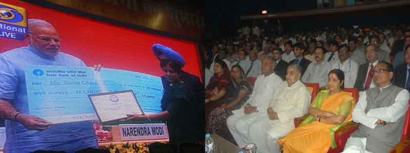 بھوپال ۔ ریاست میں وزیر اعظم جن – دھن اسکیم کا آج افتتاح ہوا۔ پروگرام کے خصوصی مہمان وزیر اعلیٰ شری شیوراج سنگھ چوہان تھے ۔ صدارت وزیر خارجہ شریمتی سشما سوراج نے کی ۔ وزیر اعلیٰ شری چوہان نے کہا کہ یہ اسکیم غریبوں کے اچھے دن لانے والی اسکیم ہے ۔ وزیر خارجہ شریمتی سوراج نے کہا کہ اسکیم غریبوں کے خوابوں کو پورا کرے گی ۔ اس موقع پر سابق وزیر اعلیٰ شری کیلاش جوشی ،ممبر پارلیامنٹ اور بھاجپا کے صوبائی صدر شری نند کمار سنگھ چوہان ، میئر شریمتی کرشنا گور ، ضلع پنچایت چیئرمین شریمتی مینا ہمت سنگھ گوئل ، ایم ایل اےز شری رامیشور شرما اور شری سریندر ناتھ سنگھ موجود تھے ۔